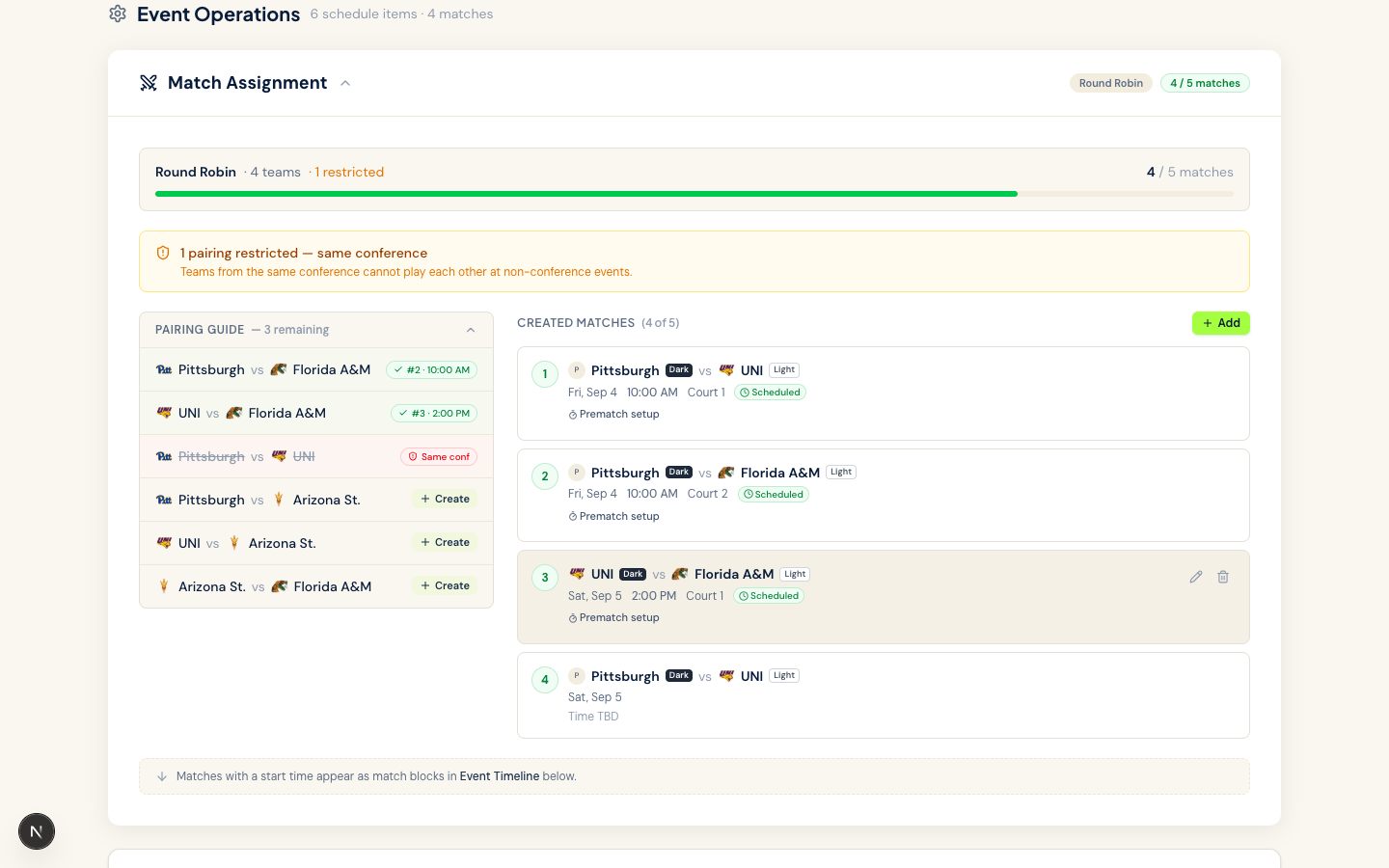 Build event timelines, assign matches to courts, and share itineraries with guest teams. Hosts and guests stay synchronized.