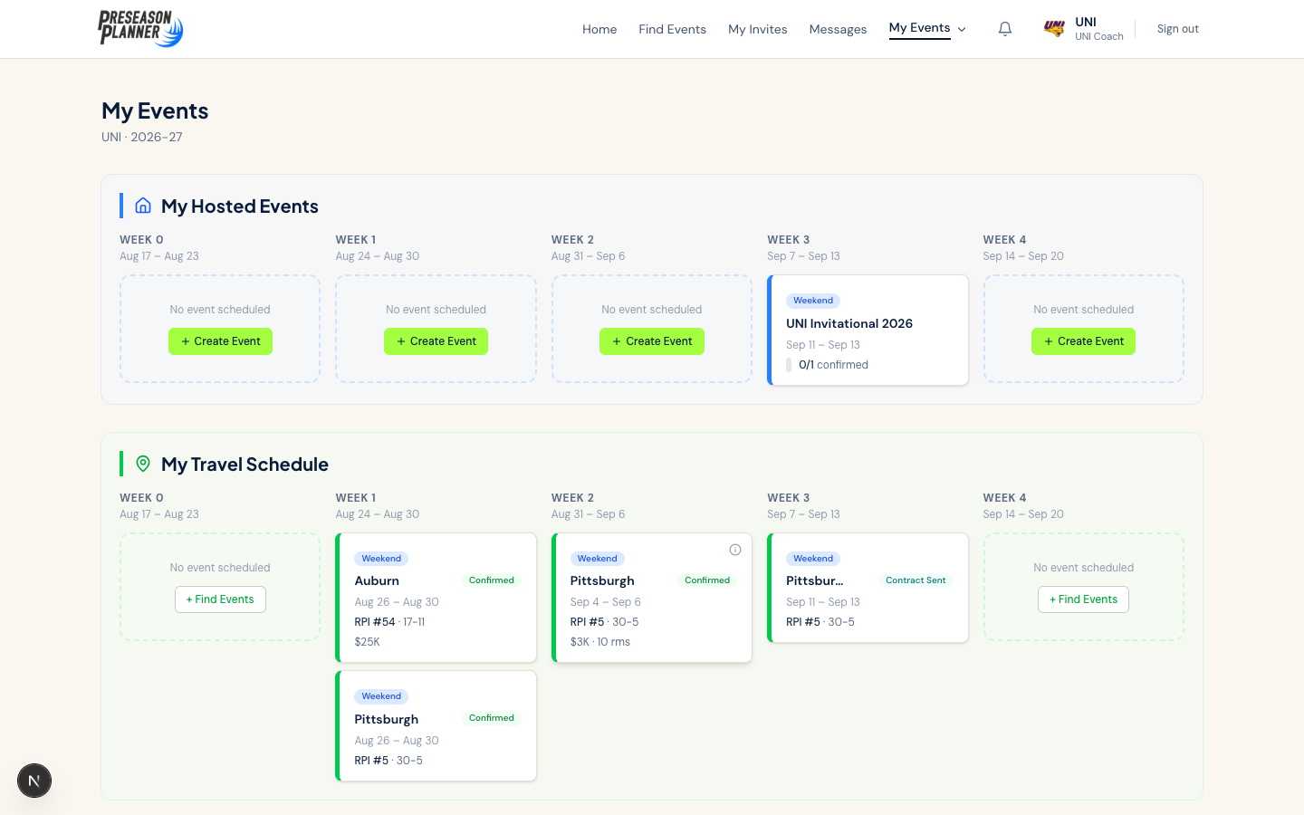 Event search, invite management, game day coordination, and season strategy — all in one platform built for D1 women's volleyball.