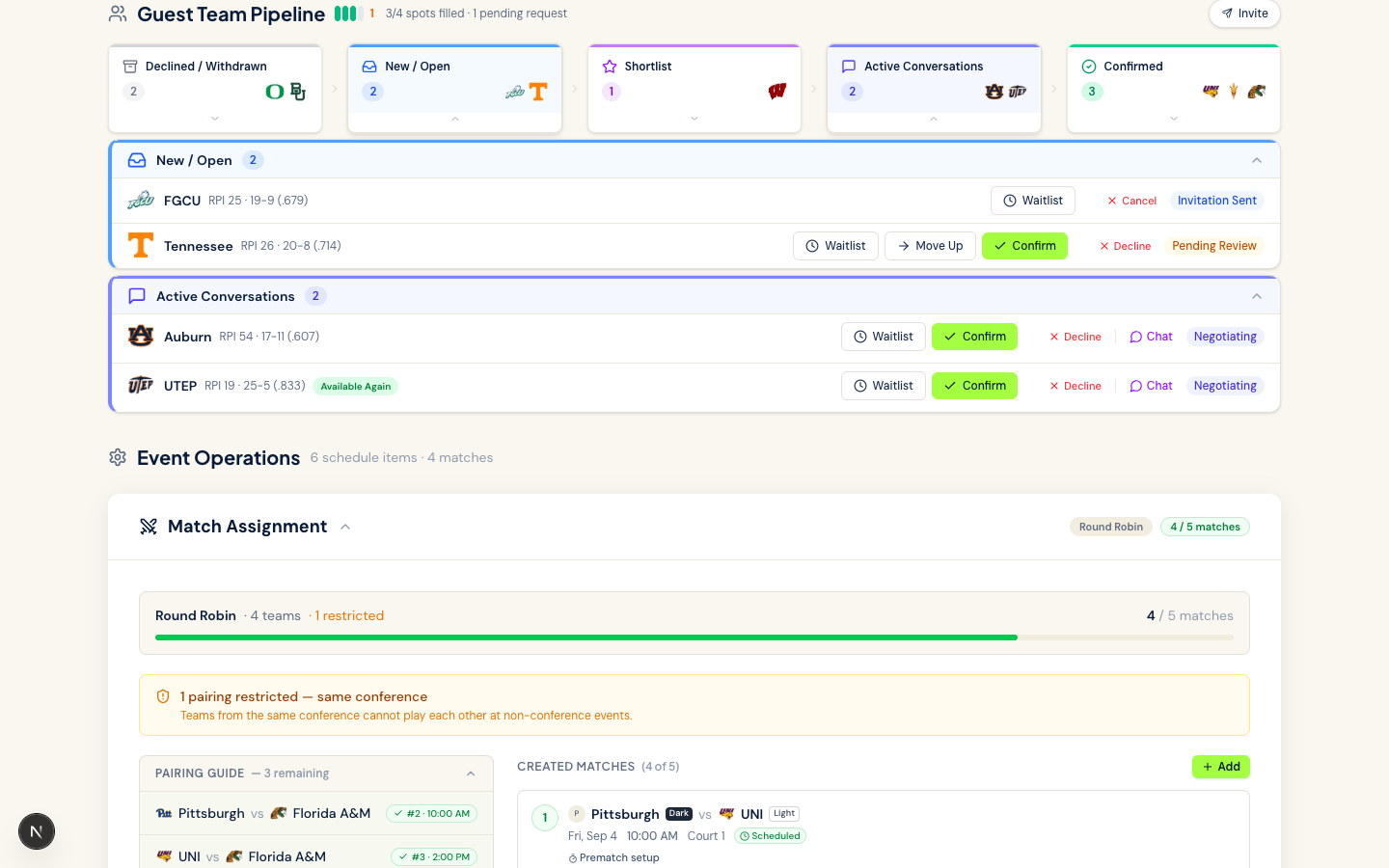 Track every invite from first contact to confirmed commitment. See who's interested, who's negotiating, and who's moved on — all in real time. Know immediately when a team commits elsewhere so you can pivot fast.