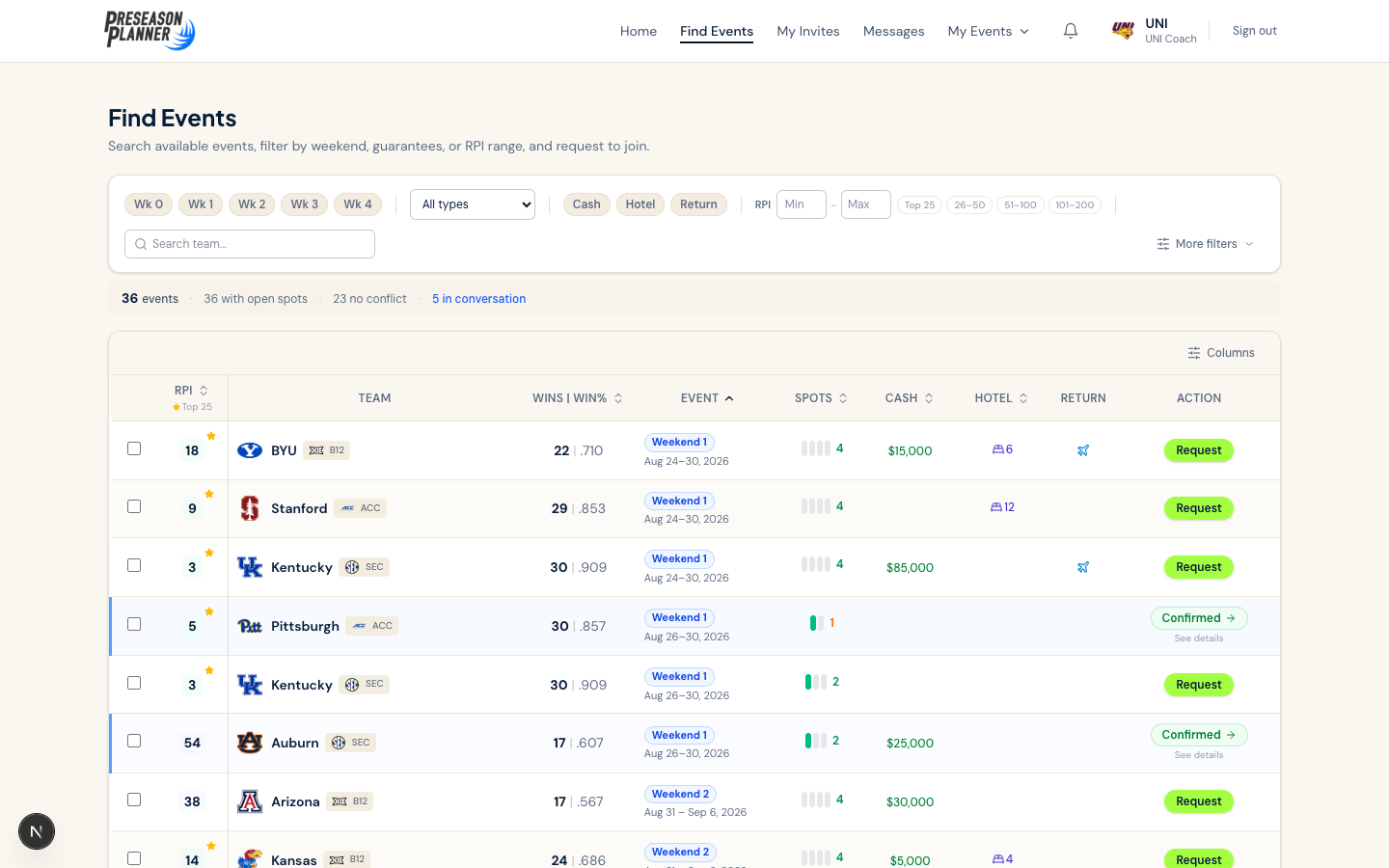 Search 340+ D1 programs by RPI, conference, open weekends, and guarantees. Filter by cash offers, hotel accommodations, and available spots — updated in real time as teams commit.